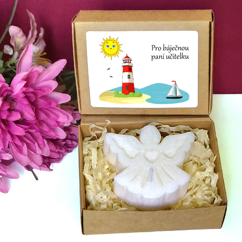 Bílá svíčka ve tvaru andílka v krabičce s tématickým obrázkem představuje milou drobnou pozornost pro učitelku nebo asistentku ve školce, vychovatelku v družině, tetu v dětské skupině či pro kohokoliv jiného dle Vašeho uvážení. Vybírat můžete z několika textů nebo si sepsat svůj vlastní. Jelikož jsou krabičky menší, vejde se na etiketu jen pár slov.