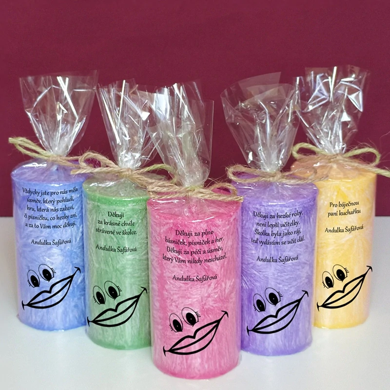 Vybírat můžete z několika textů, přičemž každý lze doplnit o podpis dítěte. První tři textíky jsou mé rýmovačky pro učitelky, další jsou prostá věnování pro asistentku či pro kuchařku. Vybraný text a barvu svíčky zvolte výše v roletce a poté vložte svíčku do košíku. Můžete mít ale i vlastní text - zvolte v roletce možnost "vlastní text" a připište jej do poznámky objednávky.