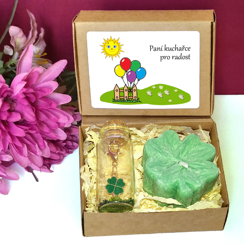 Dárková sada pro štěstí se sestává ze svíčky ve tvaru čtyřlístku a dekorativní lahvičky s klíčenkou se čtyřlístkem. Skvěle poslouží jako milý dáreček k vyjádření díků paní učitelce ve školce, asistence či dalšímu personálu školky za péči a starost.