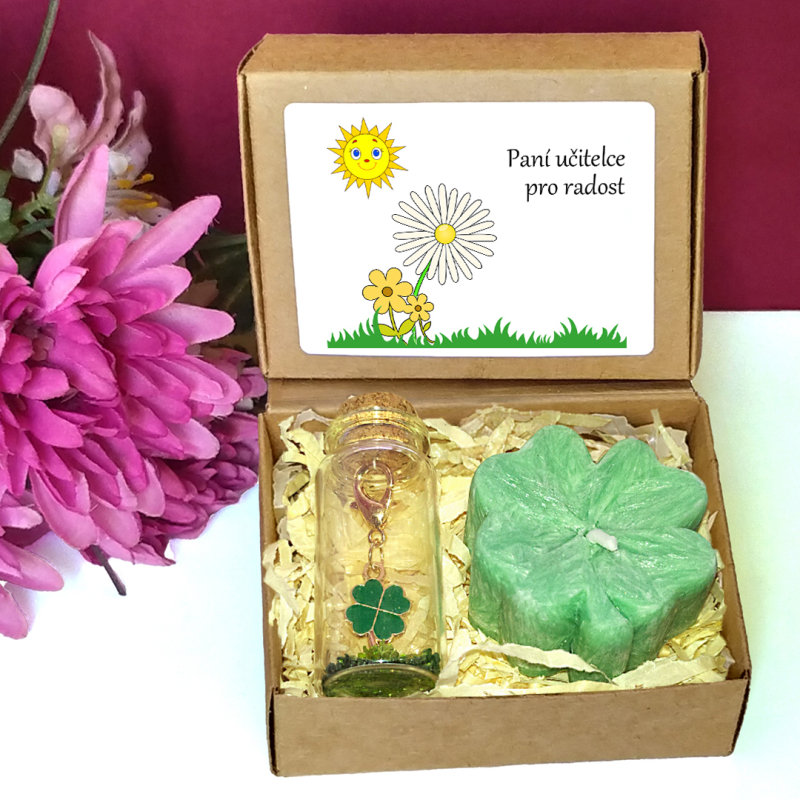 Dárková sada pro štěstí se sestává ze svíčky ve tvaru čtyřlístku a dekorativní lahvičky s klíčenkou se čtyřlístkem. Skvěle poslouží jako milý dáreček k vyjádření díků paní učitelce ve školce, asistence či dalšímu personálu školky za péči a starost.