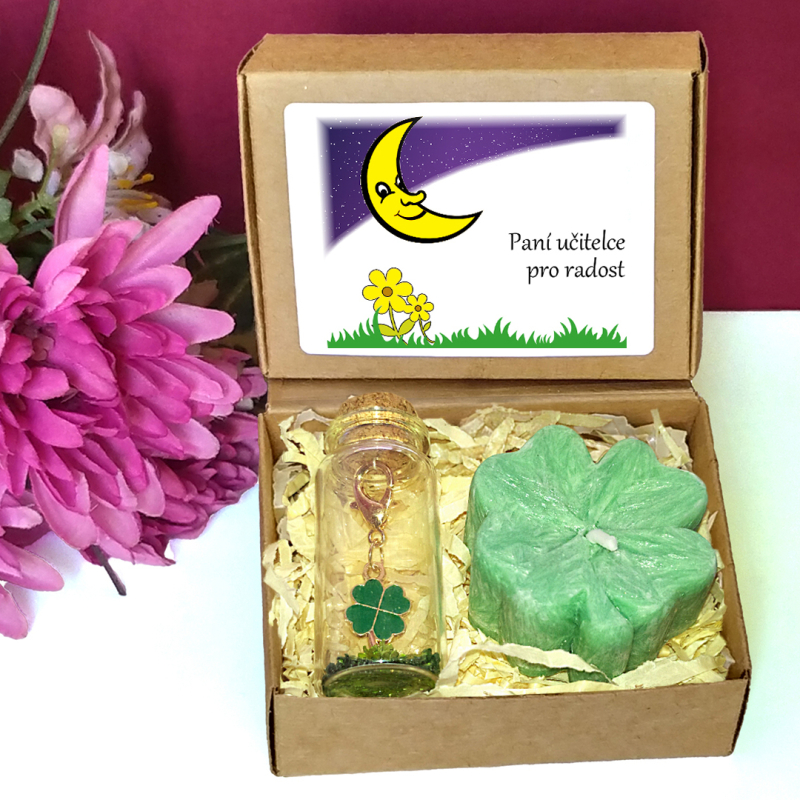 Dárková sada pro štěstí se sestává ze svíčky ve tvaru čtyřlístku a dekorativní lahvičky s klíčenkou se čtyřlístkem. Skvěle poslouží jako milý dáreček k vyjádření díků paní učitelce ve školce, asistence či dalšímu personálu školky za péči a starost.