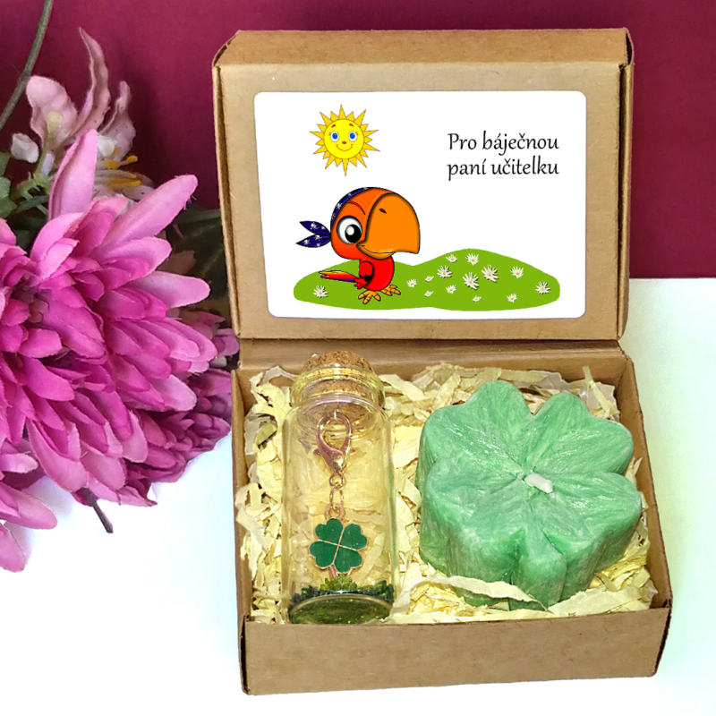 Dárková sada pro štěstí se sestává ze svíčky ve tvaru čtyřlístku a dekorativní lahvičky s klíčenkou se čtyřlístkem. Skvěle poslouží jako milý dáreček k vyjádření díků paní učitelce ve školce, asistence či dalšímu personálu školky za péči a starost.
