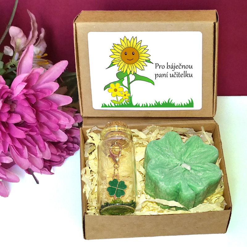Dárková sada pro štěstí se sestává ze svíčky ve tvaru čtyřlístku a dekorativní lahvičky s klíčenkou se čtyřlístkem. Skvěle poslouží jako milý dáreček k vyjádření díků paní učitelce ve školce, asistence či dalšímu personálu školky za péči a starost.