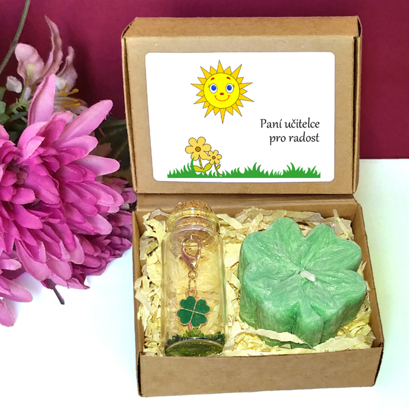 Dárková sada pro štěstí se sestává ze svíčky ve tvaru čtyřlístku a dekorativní lahvičky s klíčenkou se čtyřlístkem. Skvěle poslouží jako milý dáreček k vyjádření díků paní učitelce ve školce, asistence či dalšímu personálu školky za péči a starost.