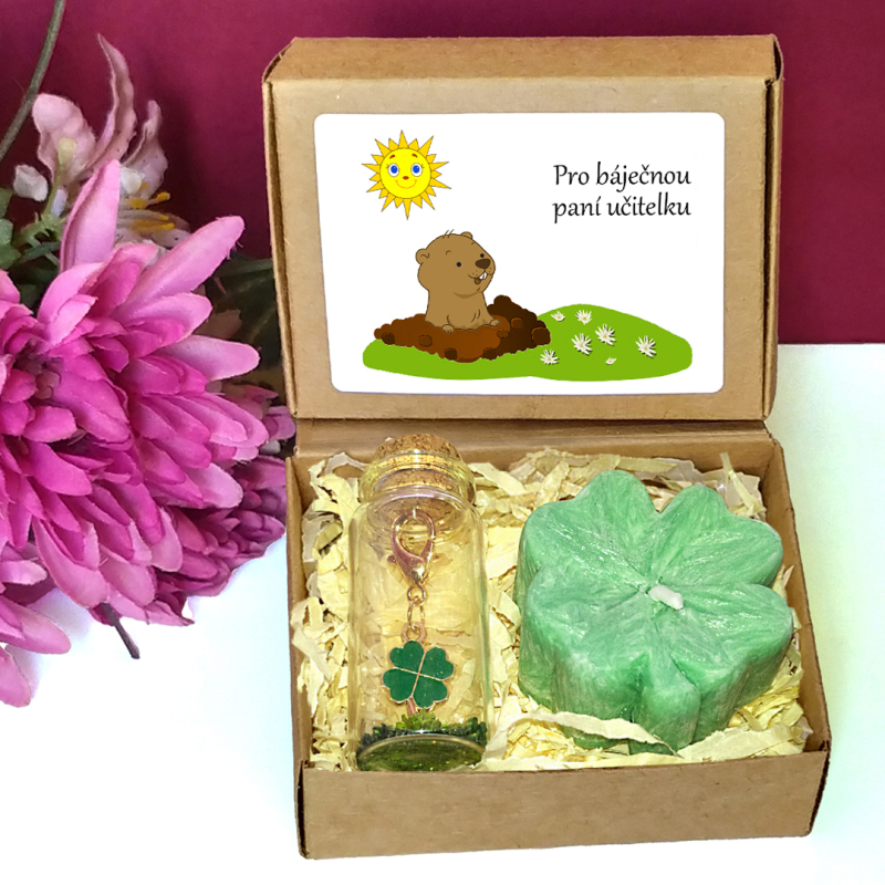 Dárková sada pro štěstí se sestává ze svíčky ve tvaru čtyřlístku a dekorativní lahvičky s klíčenkou se čtyřlístkem. Skvěle poslouží jako milý dáreček k vyjádření díků paní učitelce ve školce, asistence či dalšímu personálu školky za péči a starost.