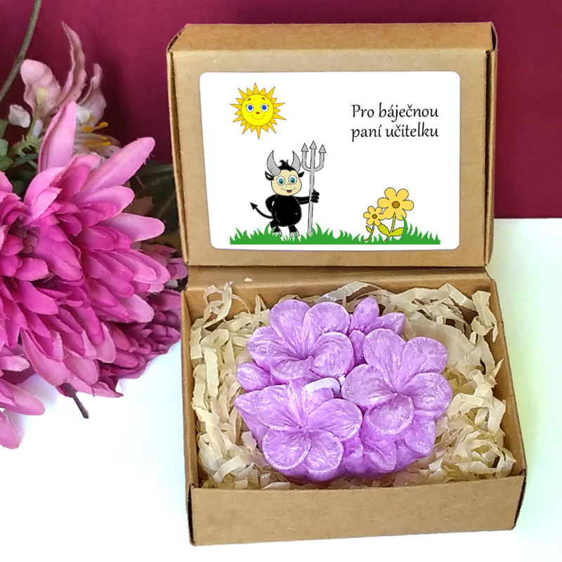 Fialová svíčka ve tvaru tří kvítků v krabičce s tématickým obrázkem představuje milou drobnou pozornost pro učitelku nebo asistentku ve školce, vychovatelku v družině, tetu v dětské skupině či pro kohokoliv jiného dle Vašeho uvážení. Vybírat můžete z několika textů nebo si sepsat svůj vlastní. Jelikož jsou krabičky menší, vejde se na etiketu jen pár slov.