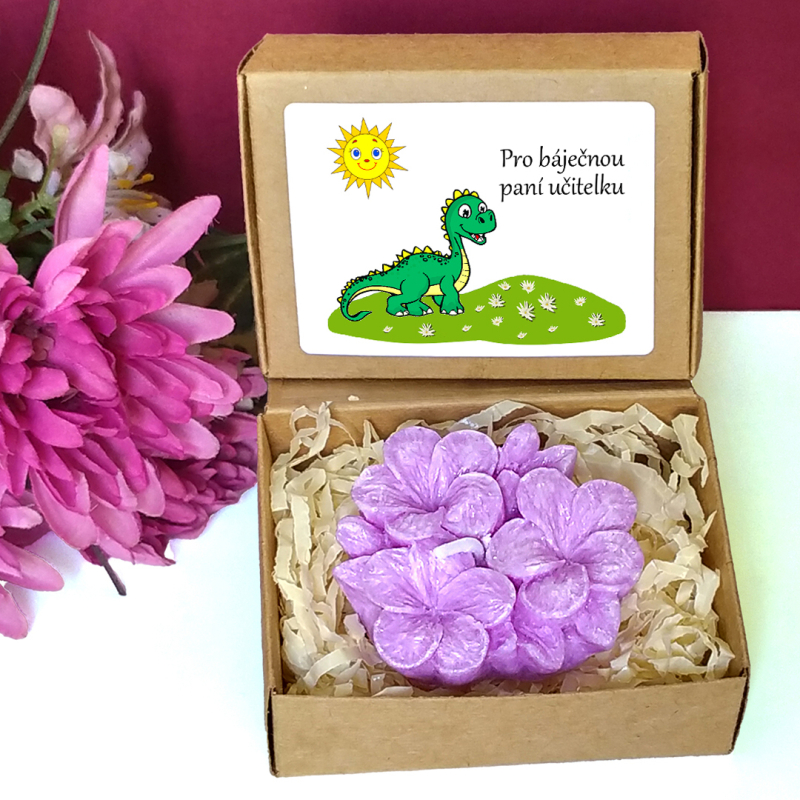 Fialová svíčka ve tvaru tří kvítků v krabičce s tématickým obrázkem představuje milou drobnou pozornost pro učitelku nebo asistentku ve školce, vychovatelku v družině, tetu v dětské skupině či pro kohokoliv jiného dle Vašeho uvážení. Vybírat můžete z několika textů nebo si sepsat svůj vlastní. Jelikož jsou krabičky menší, vejde se na etiketu jen pár slov.