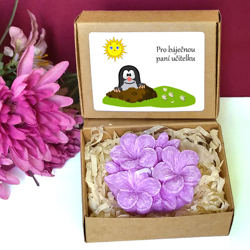 Fialová svíčka ve tvaru tří kvítků v krabičce s tématickým obrázkem představuje milou drobnou pozornost pro učitelku nebo asistentku ve školce, vychovatelku v družině, tetu v dětské skupině či pro kohokoliv jiného dle Vašeho uvážení. Vybírat můžete z několika textů nebo si sepsat svůj vlastní. Jelikož jsou krabičky menší, vejde se na etiketu jen pár slov.