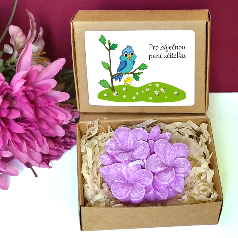 Fialová svíčka ve tvaru tří kvítků v krabičce s tématickým obrázkem představuje milou drobnou pozornost pro učitelku nebo asistentku ve školce, vychovatelku v družině, tetu v dětské skupině či pro kohokoliv jiného dle Vašeho uvážení. Vybírat můžete z několika textů nebo si sepsat svůj vlastní. Jelikož jsou krabičky menší, vejde se na etiketu jen pár slov.