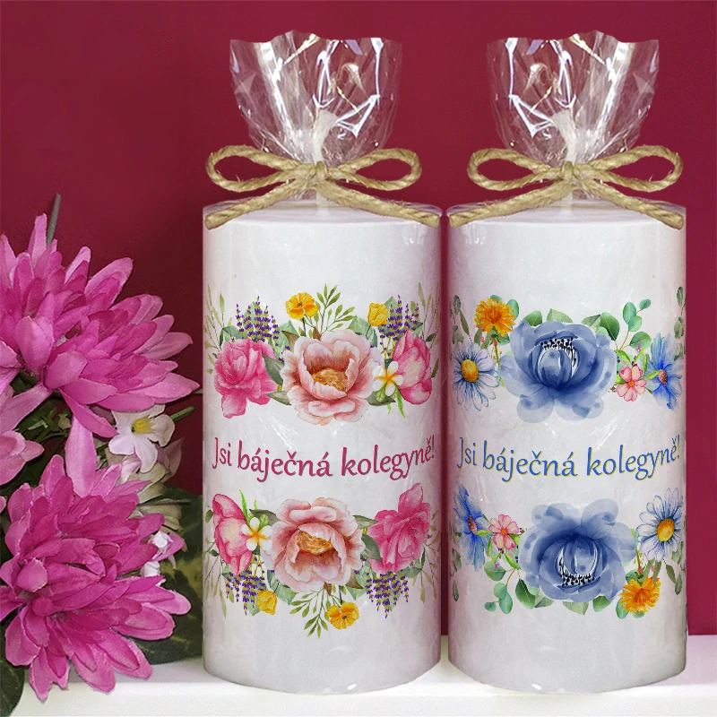 Svíčka je dekorována květinovým dekorem s nápisem "Jsi úžasná kolegyně!". Na výběr máte ze dvou barevných variant (modrá a růžová) a dvou velikostí svíčky - vyberte výše v roletkách.