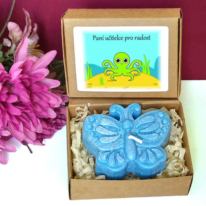 Modrá svíčka ve tvaru motýla v krabičce s tématickým obrázkem představuje milou drobnou pozornost pro učitelku nebo asistentku ve školce, vychovatelku v družině, tetu v dětské skupině či pro kohokoliv jiného dle Vašeho uvážení. Vybírat můžete z několika textů nebo si sepsat svůj vlastní. Jelikož jsou krabičky menší, vejde se na etiketu jen pár slov.