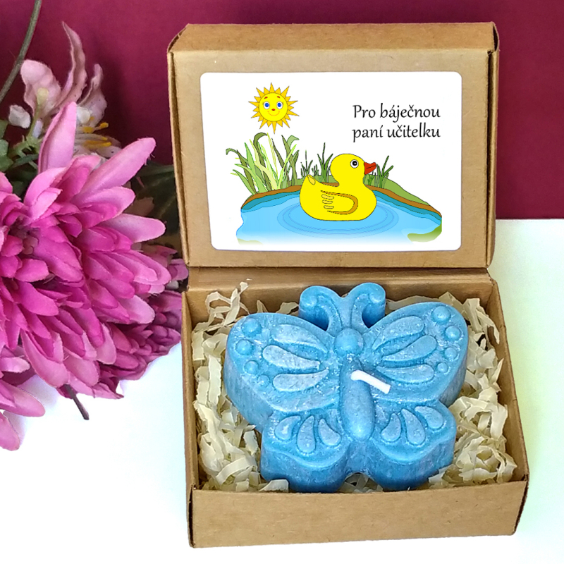 Modrá svíčka ve tvaru motýla v krabičce s tématickým obrázkem představuje milou drobnou pozornost pro učitelku nebo asistentku ve školce, vychovatelku v družině, tetu v dětské skupině či pro kohokoliv jiného dle Vašeho uvážení. Vybírat můžete z několika textů nebo si sepsat svůj vlastní. Jelikož jsou krabičky menší, vejde se na etiketu jen pár slov.
