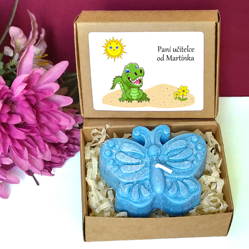 Modrá svíčka ve tvaru motýla v krabičce s tématickým obrázkem představuje milou drobnou pozornost pro učitelku nebo asistentku ve školce, vychovatelku v družině, tetu v dětské skupině či pro kohokoliv jiného dle Vašeho uvážení. Vybírat můžete z několika textů nebo si sepsat svůj vlastní. Jelikož jsou krabičky menší, vejde se na etiketu jen pár slov.