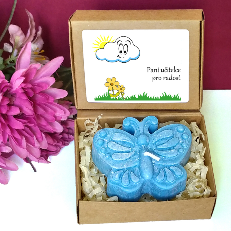 Modrá svíčka ve tvaru motýla v krabičce s tématickým obrázkem představuje milou drobnou pozornost pro učitelku nebo asistentku ve školce, vychovatelku v družině, tetu v dětské skupině či pro kohokoliv jiného dle Vašeho uvážení. Vybírat můžete z několika textů nebo si sepsat svůj vlastní. Jelikož jsou krabičky menší, vejde se na etiketu jen pár slov.