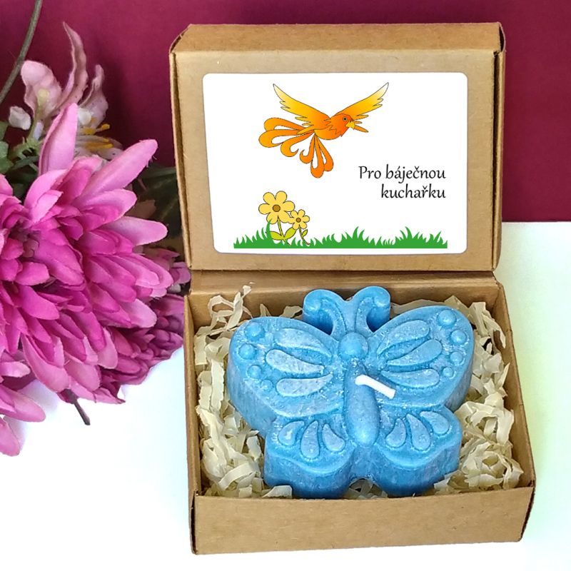 Modrá svíčka ve tvaru motýla v krabičce s tématickým obrázkem představuje milou drobnou pozornost pro učitelku nebo asistentku ve školce, vychovatelku v družině, tetu v dětské skupině či pro kohokoliv jiného dle Vašeho uvážení. Vybírat můžete z několika textů nebo si sepsat svůj vlastní. Jelikož jsou krabičky menší, vejde se na etiketu jen pár slov.