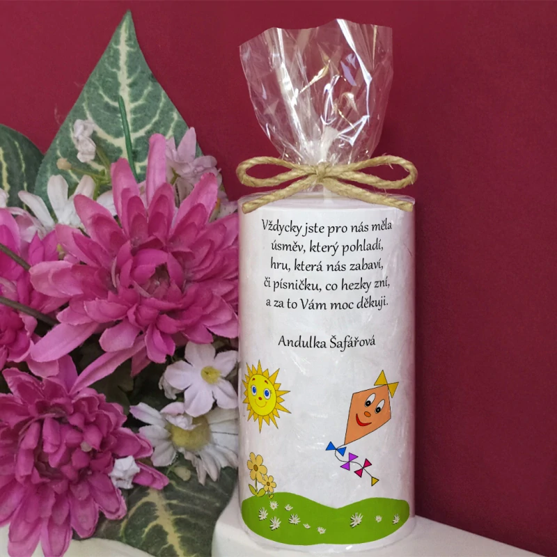 Vybírat můžete z několika textů. První tři textíky jsou mé rýmovačky pro učitelky, další jsou prostá věnování pro asistentku či pro kuchařku. Můžete mít ale i vlastní text. Připojit lze i podpis dítěte. Vybraný text zvolte výše v roletce a poté vložte svíčku do košíku.