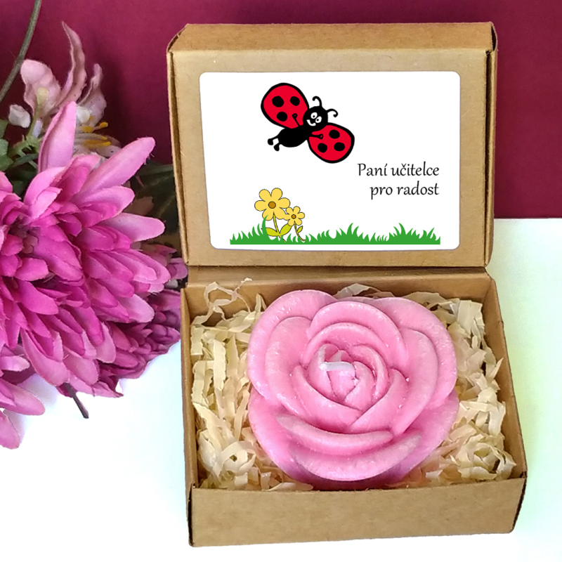 Růžová svíčka ve tvaru květu růže v krabičce s tématickým obrázkem představuje milou drobnou pozornost pro učitelku nebo asistentku ve školce, vychovatelku v družině, tetu v dětské skupině či pro kohokoliv jiného dle Vašeho uvážení. Vybírat můžete z několika textů nebo si sepsat svůj vlastní. Jelikož jsou krabičky menší, vejde se na etiketu jen pár slov.