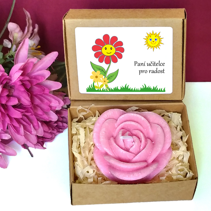 Růžová svíčka ve tvaru květu růže v krabičce s tématickým obrázkem představuje milou drobnou pozornost pro učitelku nebo asistentku ve školce, vychovatelku v družině, tetu v dětské skupině či pro kohokoliv jiného dle Vašeho uvážení. Vybírat můžete z několika textů nebo si sepsat svůj vlastní. Jelikož jsou krabičky menší, vejde se na etiketu jen pár slov.
