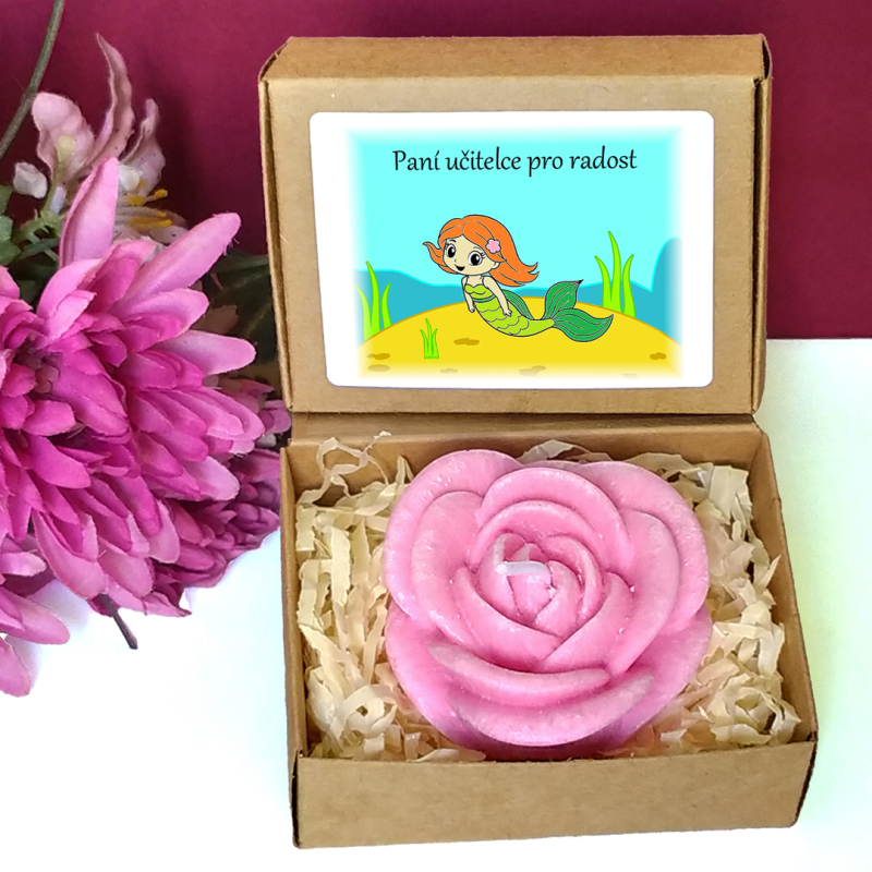 Růžová svíčka ve tvaru květu růže v krabičce s tématickým obrázkem představuje milou drobnou pozornost pro učitelku nebo asistentku ve školce, vychovatelku v družině, tetu v dětské skupině či pro kohokoliv jiného dle Vašeho uvážení. Vybírat můžete z několika textů nebo si sepsat svůj vlastní. Jelikož jsou krabičky menší, vejde se na etiketu jen pár slov.