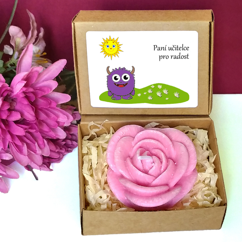 Růžová svíčka ve tvaru květu růže v krabičce s tématickým obrázkem představuje milou drobnou pozornost pro učitelku nebo asistentku ve školce, vychovatelku v družině, tetu v dětské skupině či pro kohokoliv jiného dle Vašeho uvážení. Vybírat můžete z několika textů nebo si sepsat svůj vlastní. Jelikož jsou krabičky menší, vejde se na etiketu jen pár slov.