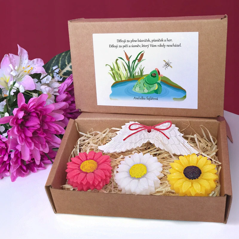 Sada kytičkových plovoucích svíček s odlitkem andělských křídel v krabičce s tématickým obrázkem a básničkou či jiným textem tvoří milý dáreček na rozloučenou s učitelkami v mateřské školce či dětské skupině. Vybírat můžete z několika textů nebo si sepsat svůj vlastní. Pod text lze dopsat i jméno dítěte.