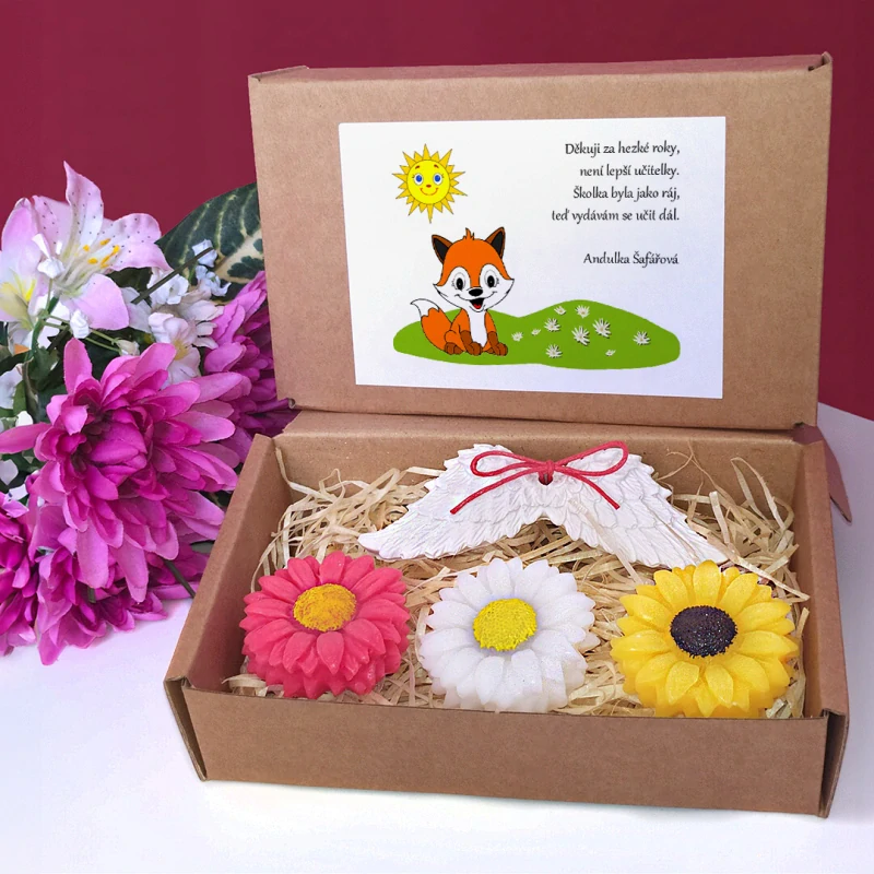 Sada kytičkových plovoucích svíček s odlitkem andělských křídel v krabičce s tématickým obrázkem a básničkou či jiným textem tvoří milý dáreček na rozloučenou s učitelkami v mateřské školce či dětské skupině. Vybírat můžete z několika textů nebo si sepsat svůj vlastní. Pod text lze dopsat i jméno dítěte.