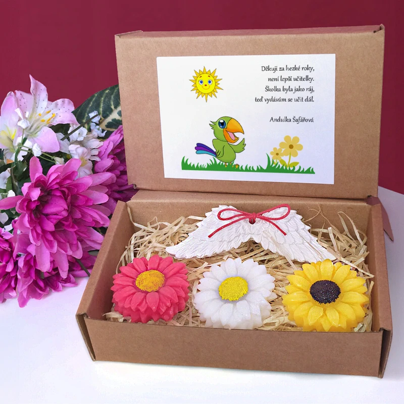 Sada kytičkových plovoucích svíček s odlitkem andělských křídel v krabičce s tématickým obrázkem a básničkou či jiným textem tvoří milý dáreček na rozloučenou s učitelkami v mateřské školce či dětské skupině. Vybírat můžete z několika textů nebo si sepsat svůj vlastní. Pod text lze dopsat i jméno dítěte.