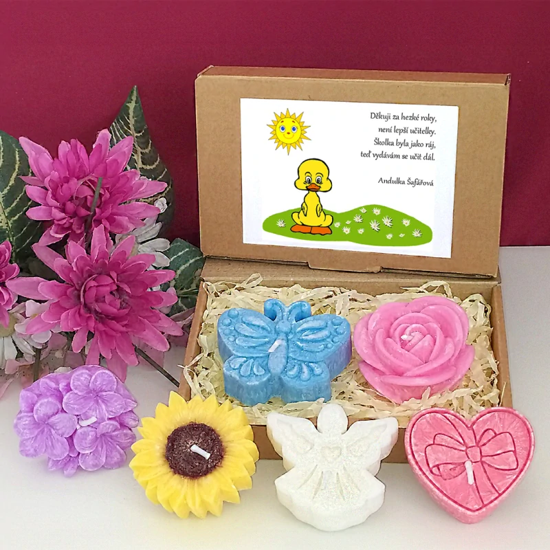 Dárkový set tvoří 2 svíčky v krabičce s tématickým obrázkem a textem, přičemž si můžete vybrat, které svíčky bude Váš dárek pro učitelku, asistentku nebo třeba i další personál školky obsahovat. Na výběr je z více různých tvarů: