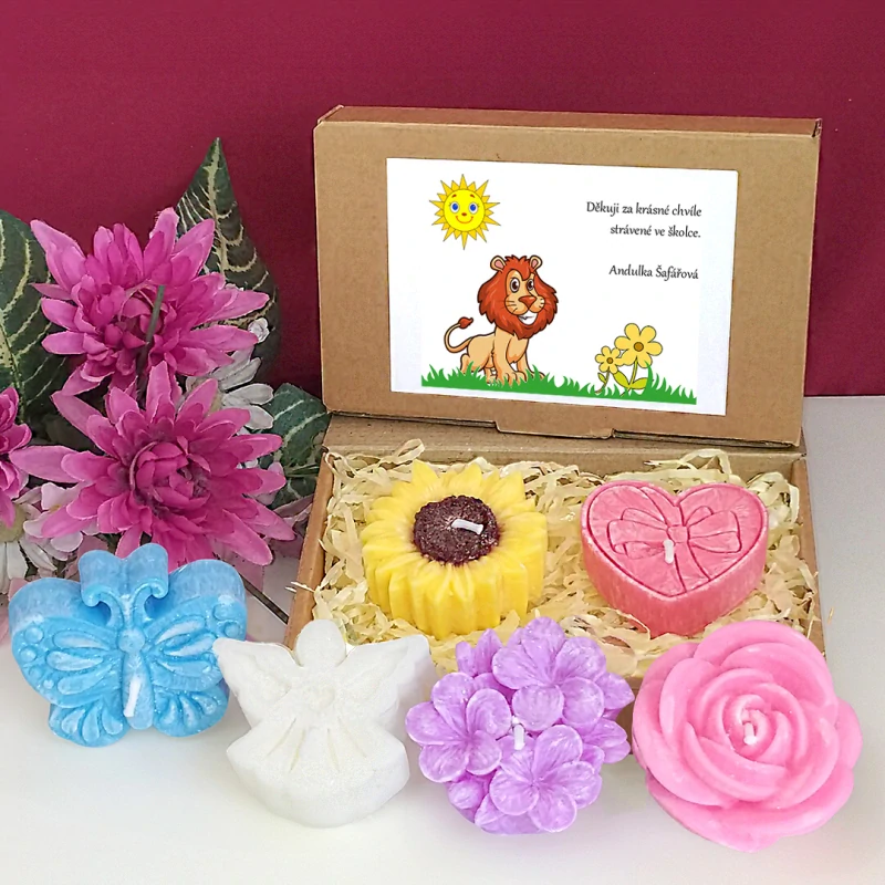 Dárkový set tvoří 2 svíčky v krabičce s tématickým obrázkem a textem, přičemž si můžete vybrat, které svíčky bude Váš dárek pro učitelku, asistentku nebo třeba i další personál školky obsahovat. Na výběr je z více různých tvarů: