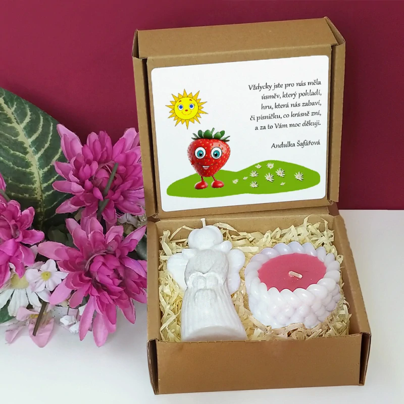 Svíčka andílek a ozdobná svíčka v dárkové krabičce s tématickým obrázkem a textem dle Vašeho výběru tvoří tento pěkný dárkový andělský set na rozloučenou či jako poděkování paní učitelce, asistentce nebo i dalšímu personálu mateřské školky.