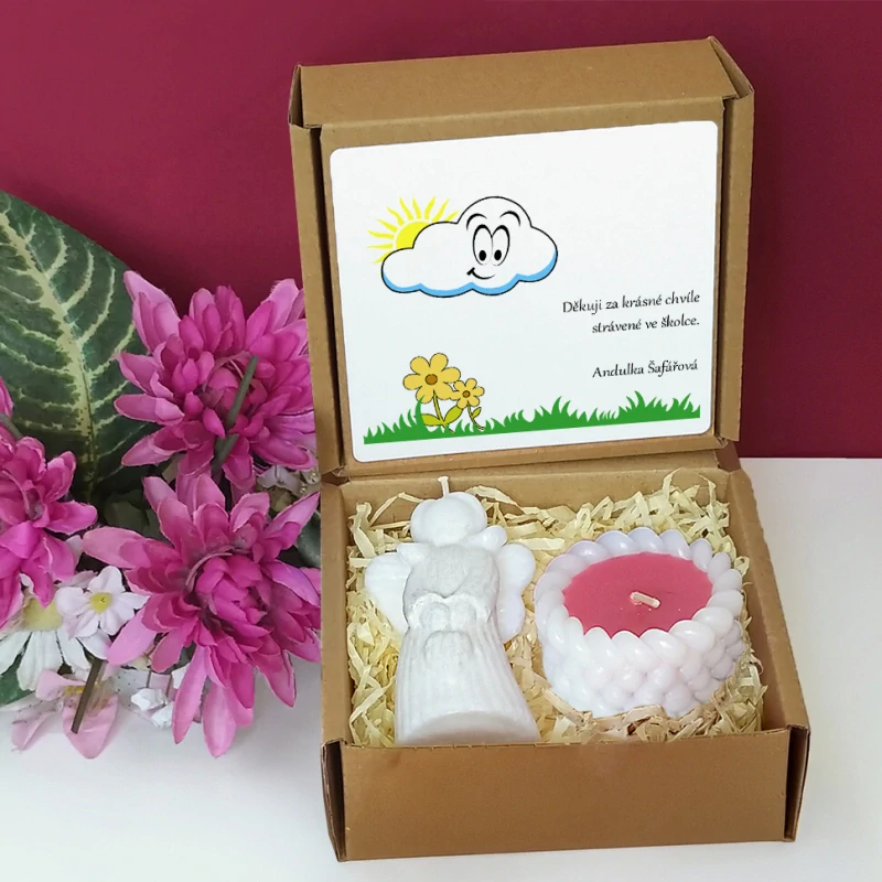Svíčka andílek a ozdobná svíčka v dárkové krabičce s tématickým obrázkem a textem dle Vašeho výběru tvoří tento pěkný dárkový andělský set na rozloučenou či jako poděkování paní učitelce, asistentce nebo i dalšímu personálu mateřské školky.