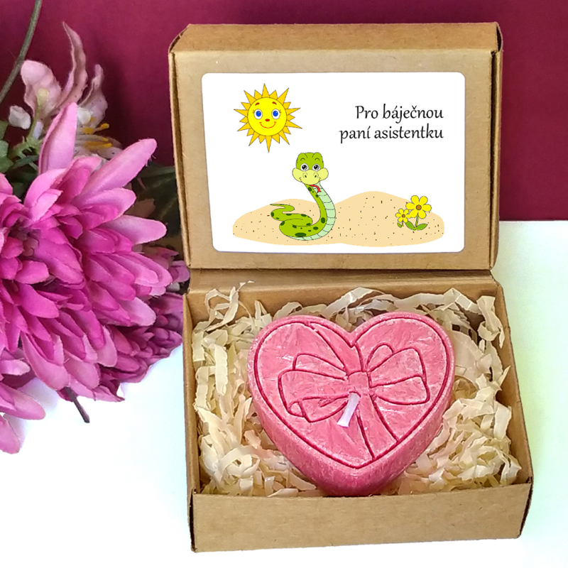 Červená svíčka ve tvaru srdíčka s mašličkou v krabičce s tématickým obrázkem představuje milou drobnou pozornost pro učitelku nebo asistentku ve školce, vychovatelku v družině, tetu v dětské skupině či pro kohokoliv jiného dle Vašeho uvážení. Vybírat můžete z několika textů nebo si sepsat svůj vlastní. Jelikož jsou krabičky menší, vejde se na etiketu jen pár slov.