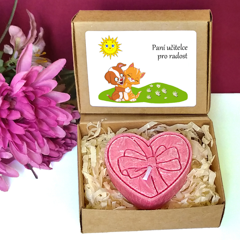 Červená svíčka ve tvaru srdíčka s mašličkou v krabičce s tématickým obrázkem představuje milou drobnou pozornost pro učitelku nebo asistentku ve školce, vychovatelku v družině, tetu v dětské skupině či pro kohokoliv jiného dle Vašeho uvážení. Vybírat můžete z několika textů nebo si sepsat svůj vlastní. Jelikož jsou krabičky menší, vejde se na etiketu jen pár slov.