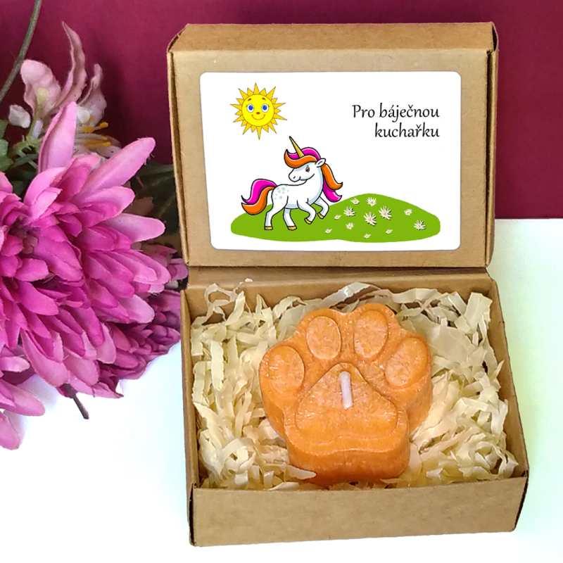 Oranžová svíčka ve tvaru psí tlapky v krabičce s tématickým obrázkem představuje milou drobnou pozornost pro učitelku nebo asistentku ve školce, vychovatelku v družině, tetu v dětské skupině či pro kohokoliv jiného dle Vašeho uvážení. Vybírat můžete z několika textů nebo si sepsat svůj vlastní. Jelikož jsou krabičky menší, vejde se na etiketu jen pár slov.