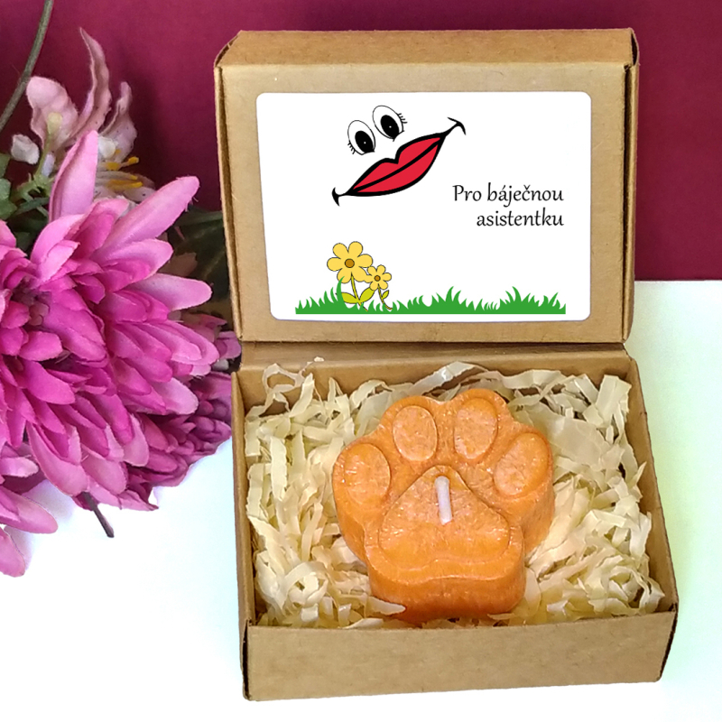 Oranžová svíčka ve tvaru psí tlapky v krabičce s tématickým obrázkem představuje milou drobnou pozornost pro učitelku nebo asistentku ve školce, vychovatelku v družině, tetu v dětské skupině či pro kohokoliv jiného dle Vašeho uvážení. Vybírat můžete z několika textů nebo si sepsat svůj vlastní. Jelikož jsou krabičky menší, vejde se na etiketu jen pár slov.