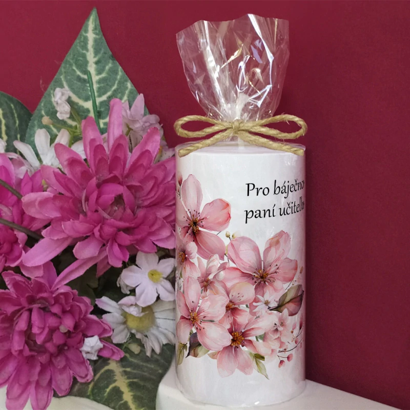Sakurové květy zdobí tyto svíčky, které se mohou stát Vaším dárečkem pro učitelku, asistentku, vychovatelku i pro kohokoliv jiného dle Vašeho uvážení. Vybírat můžete z několika textů nebo si sepsat svůj vlastní. Jelikož dekor zabíra většinu místa, vejde se na jen pár slov.