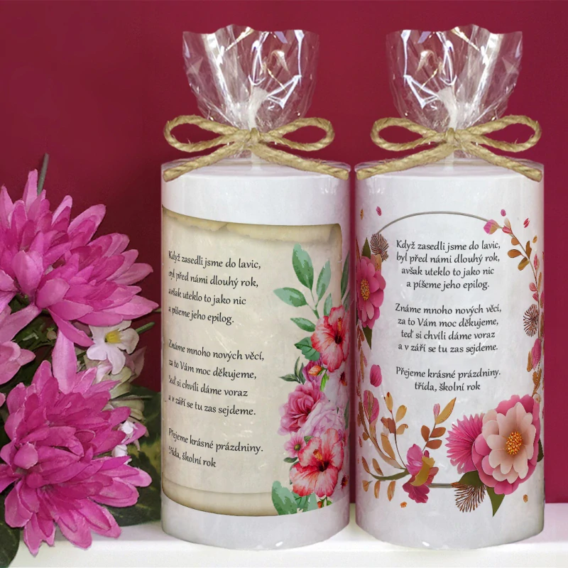 V nabídce je svíčka se dvěma dekory - obrázek listu pergamenu s květinou a květinový kruh. Do poznámky objednávky mi napište třídu a školní rok. Budou-li v poznámce údaje chybět, budu předpokládat, že jej na svíčce nechcete. Po odeslání objednávky Vám přijde e-mail s potvrzením, tak se ujistěte, že tam Vaše poznámka je.