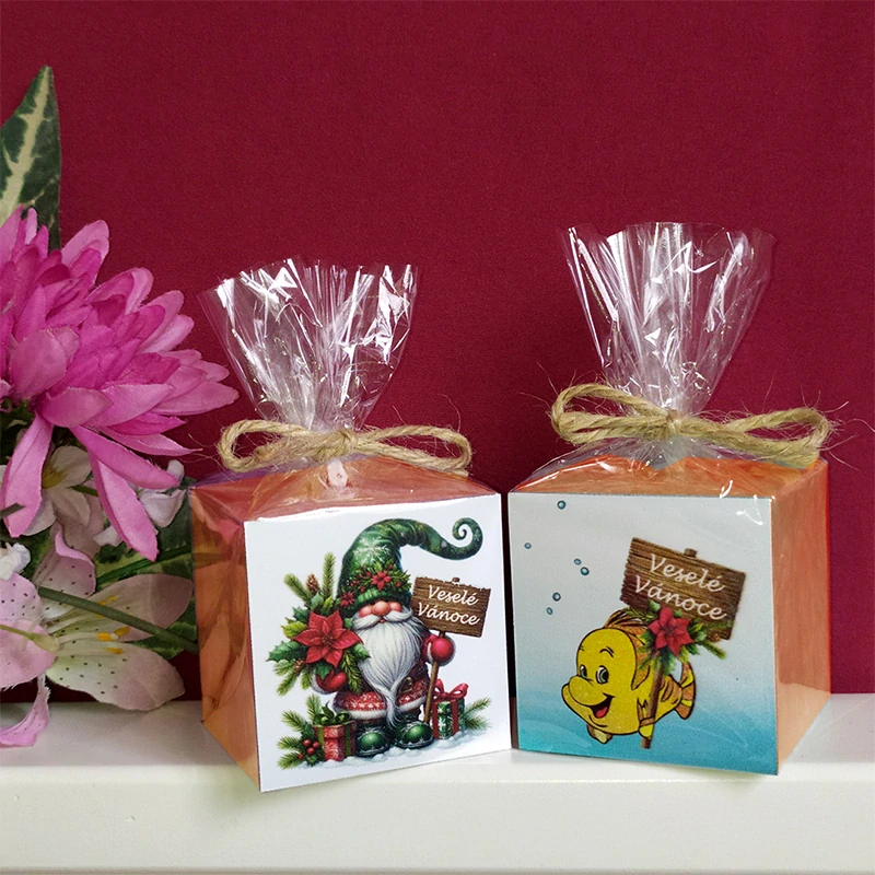 Zlatá rybka nebo vánoční skřítek na magnetce přeje Veselé Vánoce v dárkovém balení s oranžovou svíčkou ve tvaru kostky. Motiv magnetky si vyberte v roletce před přidáním svíčky do košíku.